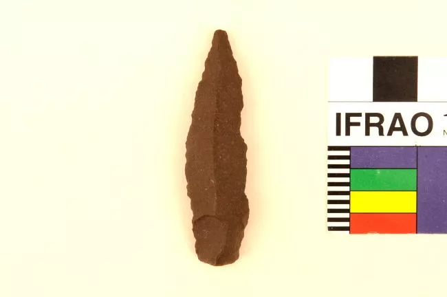 Objeto de forma alargada con ambos extremos aguzados. Superficie pulid...