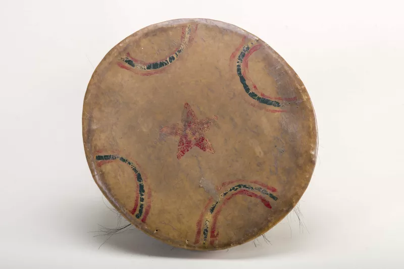 Objeto de uso ceremonial. Idiófono de forma irregular compuesto por una manija de cuero de la cual penden siete cascabeles perforados de diferentes tamaños.