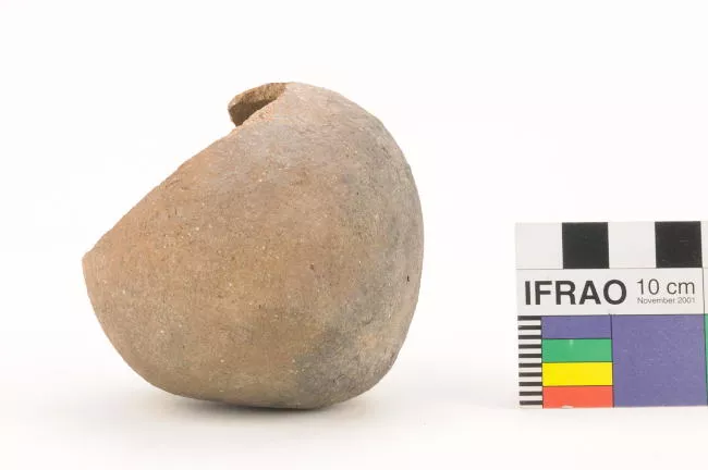Pieza de forma triangular, algo irregular, elaborada sobre un guijarro de basalto de color gris oscuro, mediante talla bifacial. Conserva parte del cortex del guijarro.