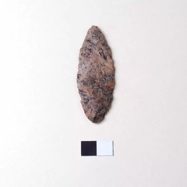 Instrumento lítico usado en faenas de pesca. Tiene forma ovalada regular, de sección plana y bordes redondeados. Tiene un sector desbastado en el sector central-lateral. Está elaborado en piedra tallada y pulida de color gris oscuro.