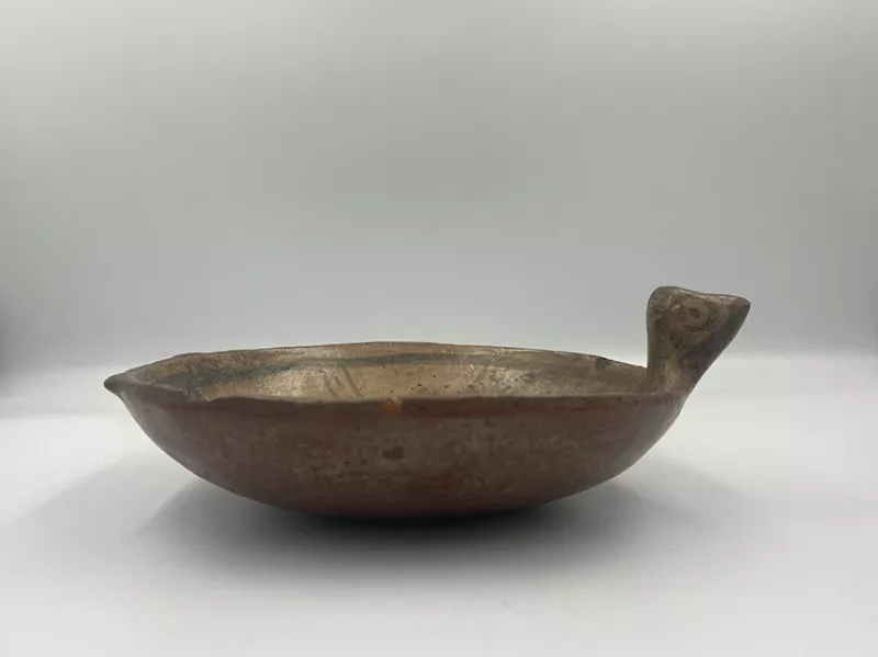 Instrumento lítico usado en faenas de pesca. Tiene forma ovalada regular, de sección plana y bordes redondeados. Tiene dos sacados laterales en el sector central. Está elaborado en piedra tallada y pulida de color gris.
