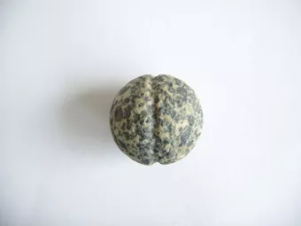 Instrumento lítico usado en faenas de pesca. Tiene forma ovalada regular, de sección plana y bordes redondeados. Tiene dos sacados laterales en el sector central. Está elaborado en piedra tallada y pulida de color gris oscuro.