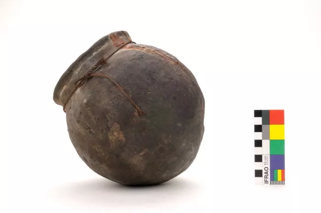 Vasija globular de base cóncava, cuello recto levemente evertido y lab...