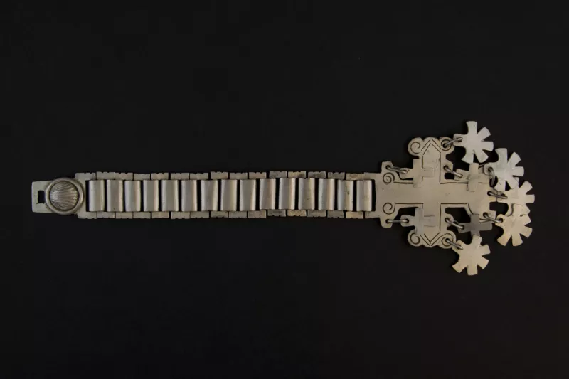 Rosario en greda teñida color negro, formado por una cruz de greda, cuentas esféricas y cilíndricas también de gredas. La cruz tiene la inscripción del lugar de procedencia.