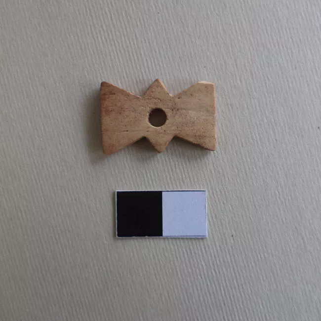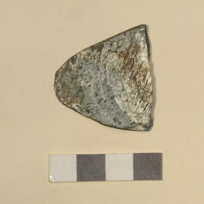 Herramienta lítica confeccionada en roca silícea, de color café rosado, de acabado opaco. Su forma corresponde a una punta de proyectil de base cóncava. Posiblemente su manera de propulsión sea flecha. Cronológica y territorialmente no se puede asociar a un período y área determinada.