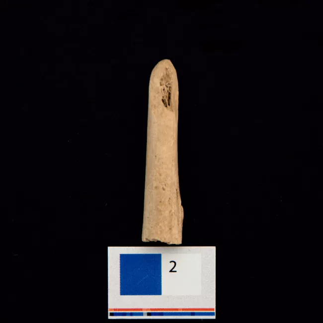 Instrumento de hueso de forma alargada con un extremo apuntado y secci...