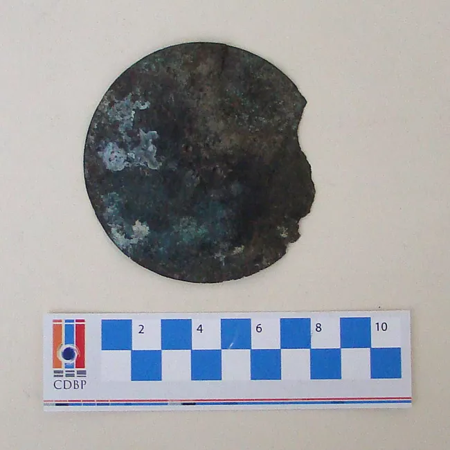 Fragmento circular de metal color oscuro con manchas verdosas y blanca...