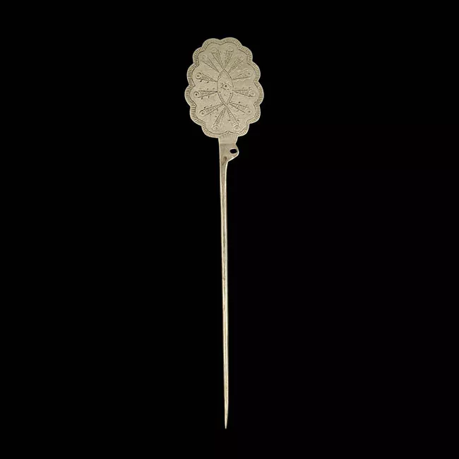 Objeto de forma rectangular oblonga, de uso personal femenino en la cultura Mapuche, como prendedor. Esta pieza consta de 2 partes: un cuerpo de forma circular, realizado con una lámina de alpaca, con graficaciones consistentes en dos círculos concéntricos, uno en el borde del cuerpo y el otro mas pequeño, en la parte central de la pieza. Dentro del círculo menor, se encuentra una cruz, cuyos extremos fueron realizados con globulaciones de mayor tamaño. Unido al cuerpo por medio de dos remaches , posee una aguja de alpaca plana.