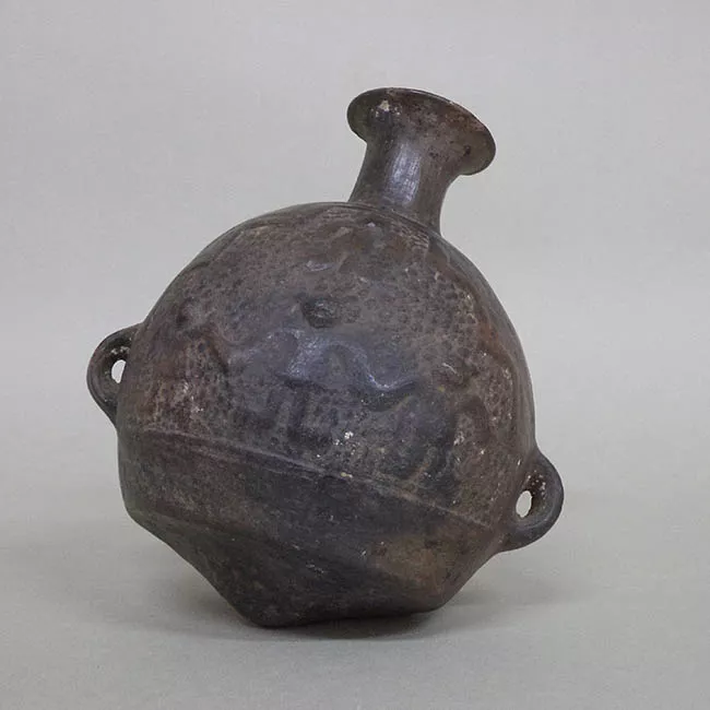 Jarro simétrico, estructura restringida con cuello, perfil compuesto con un punto de esquina en la unión cuello-cuerpo. Forma de cuerpo elipsoide horizontal. Forma de cuello hiperboloide. Tipo de borde evertido. Tipo de labio recto. Tipo de cóncava. Un asa en arco de correa, de sección subrectangular, emplazamiento borde/unión cuello-cuerpo. Tratamiento de superficie exterior: pulido, base alisada. Tratamiento de superficie interior: cuello pulido, cuerpo alisado. Color exterior e interior: café oscuro. Presenta una incisión lineal anular en la unión cuello-cuerpo. Además presenta alargamiento, redondeamiento y levantamiento del extremo inferior-exterior del asa.