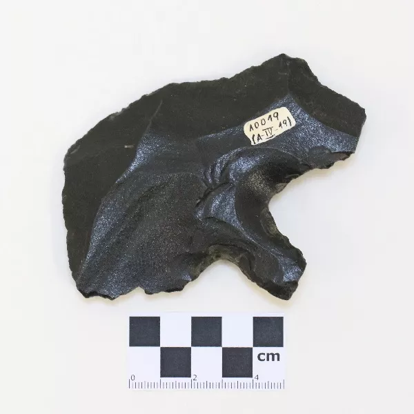 Pieza simétrica, estructura restringida, perfil inflectado. Forma de cuerpo ovoide vertical. Tipo de borde evertido reforzado. Tipo de labio convexo. Tipo de base plana (en torus). Dos asas en arco de correa, de sección subrectangular con emplazamiento en la sección superior del cuerpo. Tratamiento de superficie exterior: pulido, base alisada. Tratamiento de superficie interior: alisado. Color exterior: café rojizo y café oscuro. Color interior: café oscuro y negro.