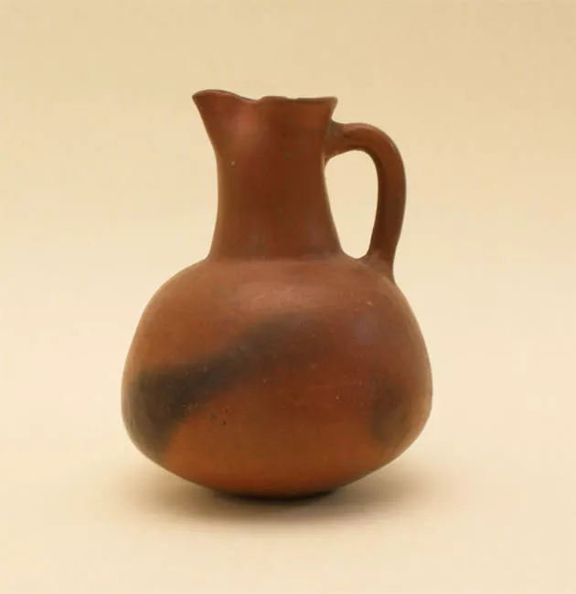 Jarro simétrico, estructura restringida con cuello, perfil complejo (con dos puntos de esquina: uno en la unión cuello-cuerpo y otro en el diámetro máximo del cuerpo). Forma de cuerpo bitroncocónico. Forma de cuello semi hiperboloide. Tipo de borde evertido. Tipo de labio recto. Tipo de base plana - definida. Un asa en arco de correa, de sección subrectangular, emplazamiento borde/sección superior del cuerpo. Tratamiento de superficie exterior e interior: alisado. Color exterior e interior: café grisáceo. Presenta alargamiento, redondeamiento y levantamiento del extremo inferior-exterior del asa. Además presenta una incisión anular lineal simple en el sector de la unión cuello-cuerpo.