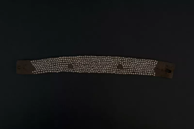 Objeto de forma rectangular oblonga, de uso personal femenino en la cultura Mapuche. Compuesto por cuatro placas irregulares, todas unidas por seis arandelas planas soldadas a la plata. De la placa inferior penden seis pin con seis arandelas de alambre soldadas a la plata.
