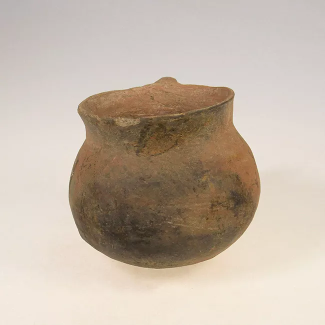 Vasija globular de estructura no restringida, de perfil compuesto de forma simétrica. El cuerpo es globular, labio plano, borde invertido, cuello cilíndrico, base plana. Presenta un asa cinta de sección elipsoidal que nace bajo en el cuello hasta conde comienza el cuerpo. Superficie pulida, color café.