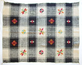 Objeto de forma rectangular oblonga, de uso personal femenino. Está compuesto por dos placas, superior e inferior, ubicadas en los extremos del objeto, y unidas por medio de tres cadenas de igual longitud, realizadas con canastillos de plata y tomas planas. De la placa superior, con estampados que representan un ave con dos cabezas, penden dos pin de forma cruciforme, uno a cada costado de la placa, unidos por medio de arandelas de alambre soldadas a la plata. Las tres cadenas, están compuestas por un total de 26 canastillos de alpaca y 29 tomas planas de alpaca soldadas a la plata. De la placa inferior penden 10 pin de forma circular con estampados florales, unidos a la placa por medio de arandelas de alambre soldadas a la plata. Esta placa posee graficaciones florales y burilados en el borde de la placa. En el reverso de la placa superior, se encuentran adheridos por medio de remaches, la toma y la traba, ambos de cobre, que sirven para pender la pieza a la ropa.