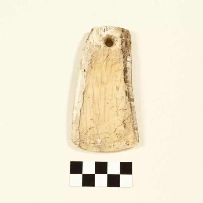 Adorno pectoral óseo, de forma aproximadamente trapezoidal y superfic...