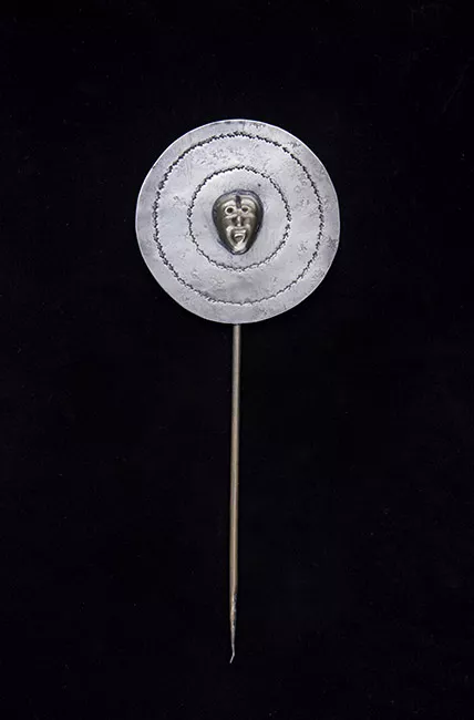 Pequeño objeto metálico de tonalidad gris, con forma irregular que, de su parte inferior sobresalen 4 orificios de los que surgen 3 pequeñas placas de plata con decoración.