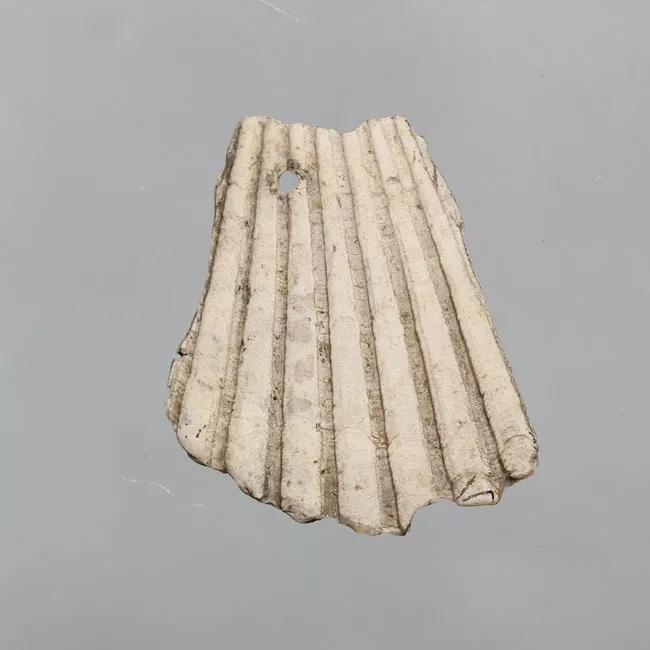 Par de pequeños objetos metálicos de forma plana y tonalidad dorada, tienen un diseño que en su parte inferior contiene 4 orificios de los que cuelgan pequeñas placas metálicas alargadas.