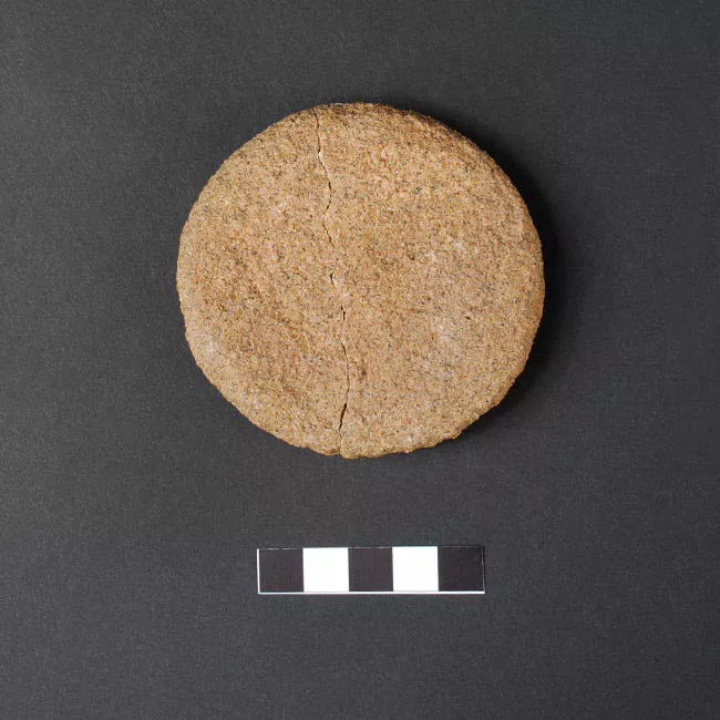 Instrumento lítico de forma semi esférica, con bordes irregulares y un...