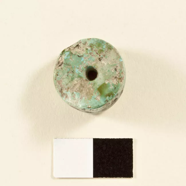 Artefacto de metal de forma general esferoidal . Presenta un agujero pequeño de 0.4 cm de ancho dentro del cual se observa un pequeño cilindro. Este cilindro interior habría servido para sujetar uno de los hilos de la boleadora.