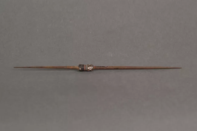 Cuchara decorada. La pala es de forma ovalada y el mango es de sección rectangular. En el extremo distal del mago se observa un enmuescado rectilíneo, este extremo es de forma apuntada. Una carcaterística de esta cuchara es que su mango se va engrosando a medida que llega a a pala, igualándola en altura.