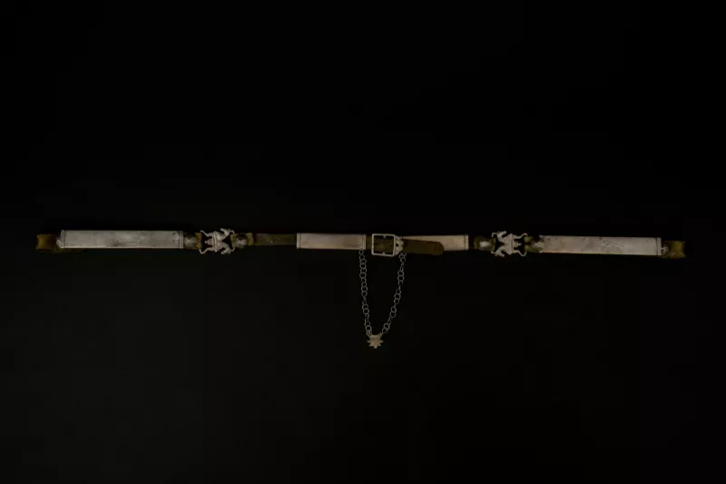 Ornamento de cabeza de forma troncocónica. Tiene una tapa circular de color café con un agujero en el centro, la cual está tejida en espiral. En el cuerpo de la pieza se observan paneles triangulares delimitados por bordes aserrados en blanco. En cada panel hay dos triángulos en colores cafe oscuro y cafe claro, dentro de los triángulos se observan diseños de ondas en forma de V en colores amarillo y verde. En dos de los paneles se identifican dos rectangulos pequeños, uno de color verde y otro naranjo. La tapa cuenta con una serie de rectangulos de color blanco, amarillos, cafe oscuro y verde. La pieza está construida con un alma de cordón de dos cabos con torsión en Z de color café, sobre la cual se realiza la técnica de anillado para construir la pieza. La fibras del cuerpo y de la tapa estan conformadas por dos cabos con torsión en S. Posee dos amarras en el borde inferior hechas con un cordón con torsión en S.