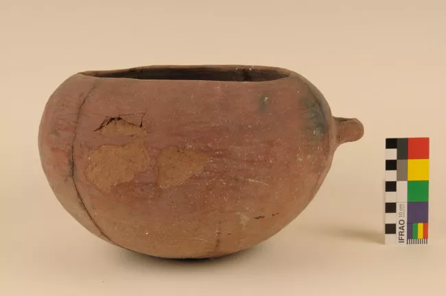 Vasija alisada, simétrica, restringida con cuello, compuesta, con dos asas en arco de correa en posición vertical cuello-cuerpo. En un sector del borde se observa erosión por exposición del antiplástico y microastillamiento en el borde. Vasija semicompleto