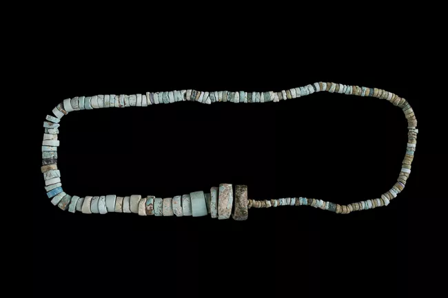 Conjunto de cuentas de forma discoidal con perforación central, hilada...