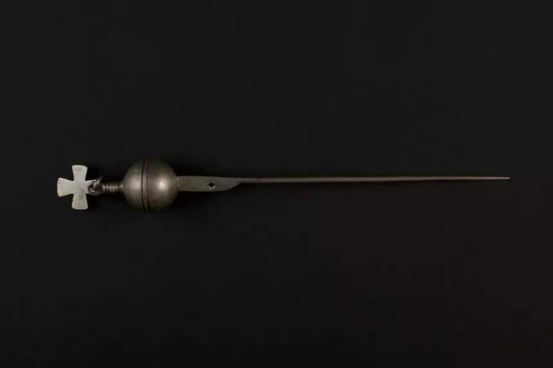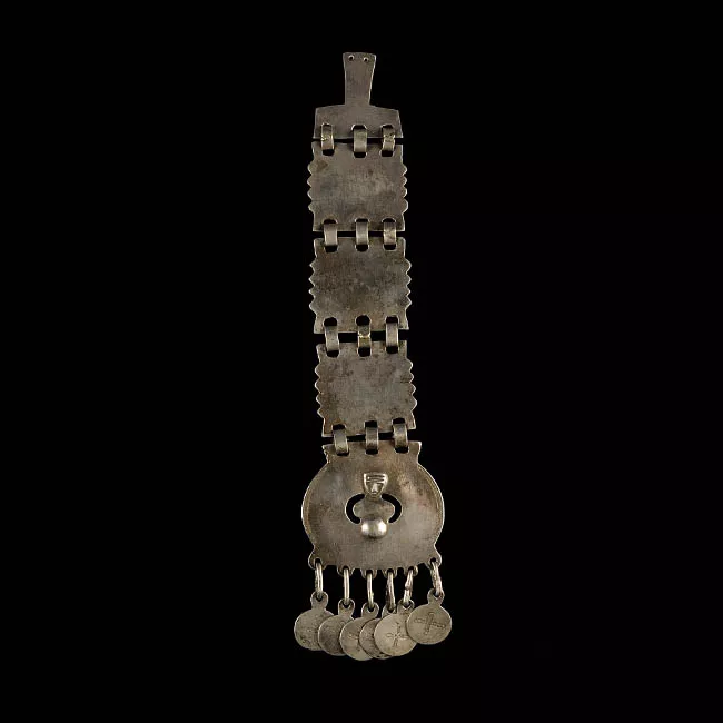 Esta joya tradicional de la mujer mapuche se elabora a partir de la técnica de colada que consiste en verter plata fundida sobre un molde de arcilla para luego ser martillada y pulida. La incrustación en forma de rostro fue incoporada posteriormente a través de la técnica de soldado.