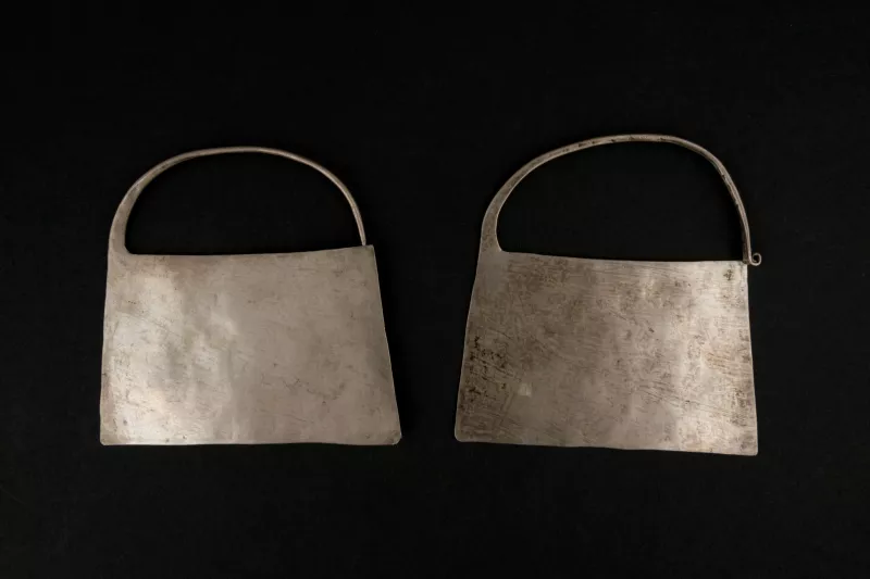 Zarcillos de plata de forma trapezoidal con base inferior curva y con gancho para colgar del lóbulo que fue soldado a la estructura. Hacia el borde de los chaway se presentan dos líneas paralelas entre sí que forman una franja delgada y que contiene una hilera de puntos al centro realizada con cincel. En el centro de las piezas se encuentra una incrustración en forma de rostro humano en relieve que posee características singulares en relación a otras representaciones antropomorfas: sus rasgos tienden a ser más curvilíneos y las concavidades correspondientes a los ojos no posee la demarcación de las cejas. Al reverso de los chaway no se presenta ningún diseño decorativo, sólo se aprecian dos marcas oscuras irregulares en la zona del centro que corresponden a la aplicación de calor para adherir figura de rostro en relieve.