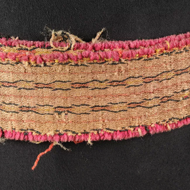 Los extremos del puente están unidos por medio de un remache a un pontezuelo de base curva con una figura trapezoidal que surge desde el centro. En los bordes, cerca del punto de unión con el bocado, posee una argolla a cada lado. La superficie de la base curva cuenta con decoración perimetral que consiste en dos líneas paralelas que contienen incisiones buriladas que dan origen a línea zigzag continua. Este diseño emerge desde los extremos y finaliza con forma de espiral en el centro de la curva.