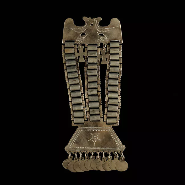 Esta pieza está compuesta por tres placas y nueve corridas de cadenas en forma de "S" enlazadas entre sí de manera vertical. La placa superior presenta diseño trapezoidal con los costados con entradas en punta. La parte superior presenta dos orificios calados uno al lado de otro, por donde se pende la prenda pectoral. La base de la placa presenta tres orificios calados por donde penden las hileras de 3 cadenas en forma de "S" verticalmente. Se penden a una placa rectangular que presenta tres orificios calados en su parte superior y tres en la parte inferior. De estos tres orificios inferiores penden también cadenas con forma de "S", esta vez, compuesta por cuatro cadenas. Se enlazan a otra placa rectangular con las mismas características, de la cual cuelgan en dos cadenas, cuatro cadenas y en la lateral izquierda sólo tres.