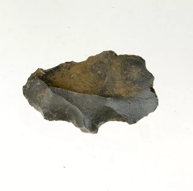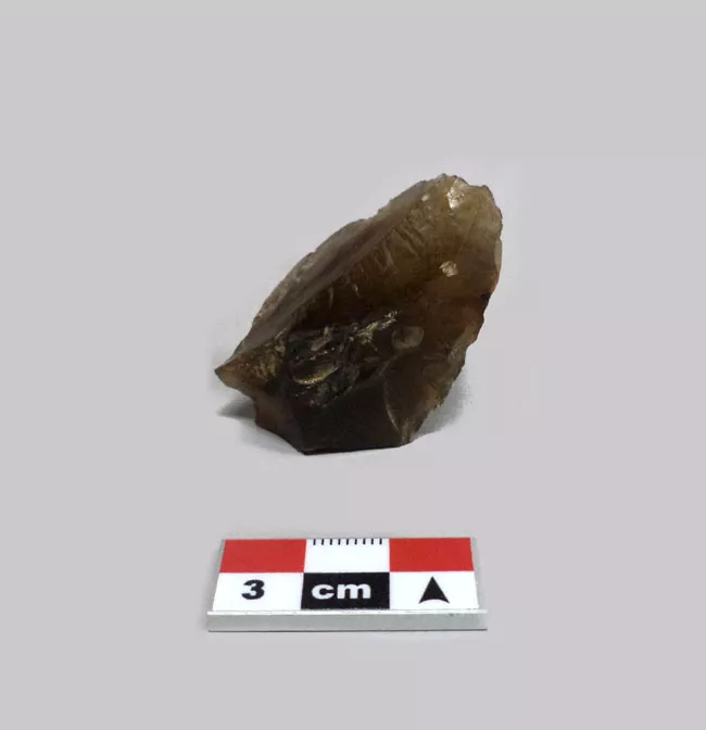 Piedra con superficie rugosa, de forma ovoidal y sección transversal elíptica, donde su extremo funcional o filo curvo, pulido y aplanado. La pieza va adelgazando levemente hasta llegar al ápice terminal que es de punta redondeada o punta roma. El borde de toda la pieza presenta un filo de perfil redondeado. En una de sus caras (superficie) presenta el rótulo "0310" con lápiz negro y fondo blanco.