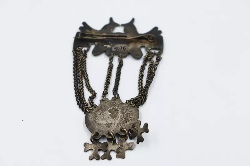 Poncho tejido en una sola pieza en técnica de tejido llano para faz de urdimbre, con urdimbres y trama de lana de oveja. La composición del textil es de un campo color negro tordo decorado con tres franjas equidistantes entre sí, de diseños escalonados de cruces concéntricas, obtenidas por teñido de reservas por amarras. Cada franja está flanqueada por dos listas delgadas de urdimbres crudas. La abertura del cuello posee en cada extremo una terminación de refuerzo correspondiente a torzal doble con flecadura en ambos costados. Ambos bordes de urdimbre presentan flecadura obtenida por los hilos de urdimbre sin tejer, los que en uno de los bordes se observan trenzados obteniéndose 19 trenzas de tres cabos.