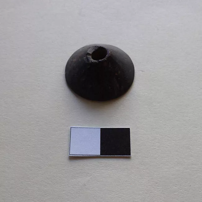 Pieza de forma triangular y de color gris con inclusiones blancas y te...