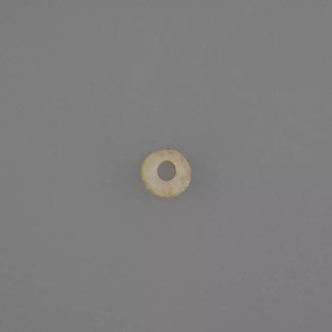 Objetos ornamentales de uso personal, uno de color blanco y el otro gris. Presentan forma discoidal, sección transversal plana, bordes rectos y una perforación central cilíndrica.
