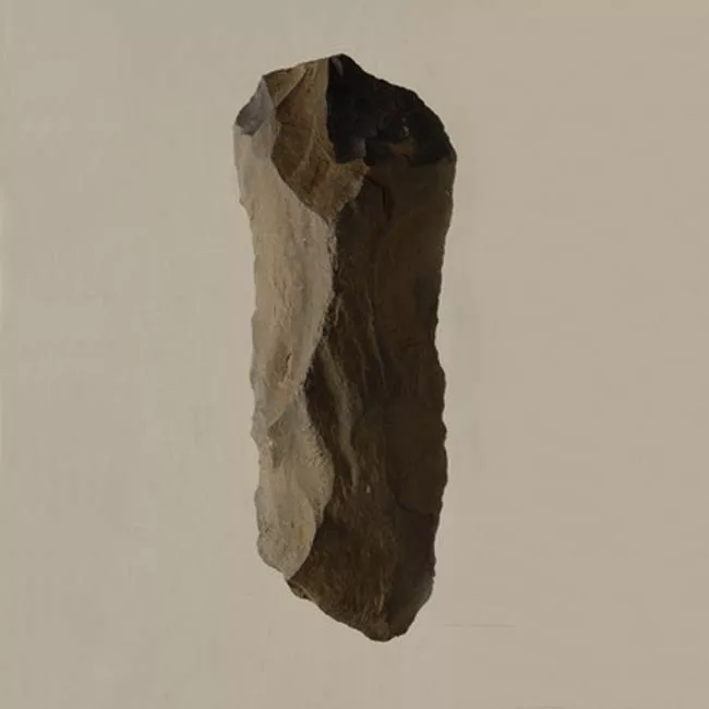 Objeto de uso doméstico de talla bifacial, elaborado en sílice de color blanco con vetas amarillas, de forma triangular apedunculada, de base escotada con aletas y sección biconvexa.