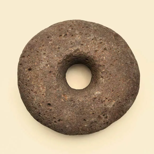 Instrumento lítico de forma toroidal, con bordes irregulares y una per...