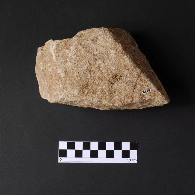 Objeto de uso doméstico de talla bifacial, elaborado en sílice opaco de color amarillo claro de forma triangular apedunculada, de base cóncava con aletas y sección biconvexa.