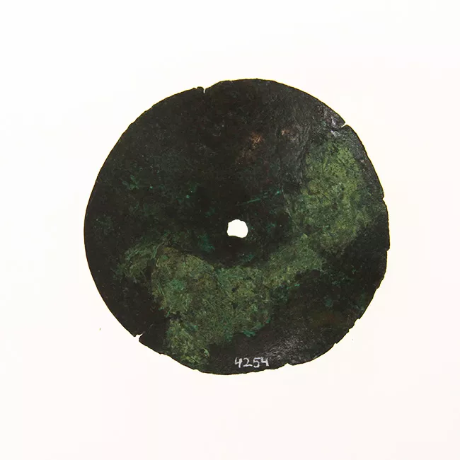 Objeto circular elaborado en cobre. Placa circular delgada y de secció...
