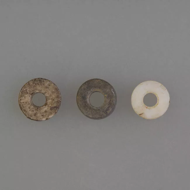 Objeto ornamental de uso personal elaborado en piedra talcosa de color gris con inclusiones blancas, de forma subrectangular, bordes redondeados, sección plana y perforación bicónica ubicada en la parte superior.