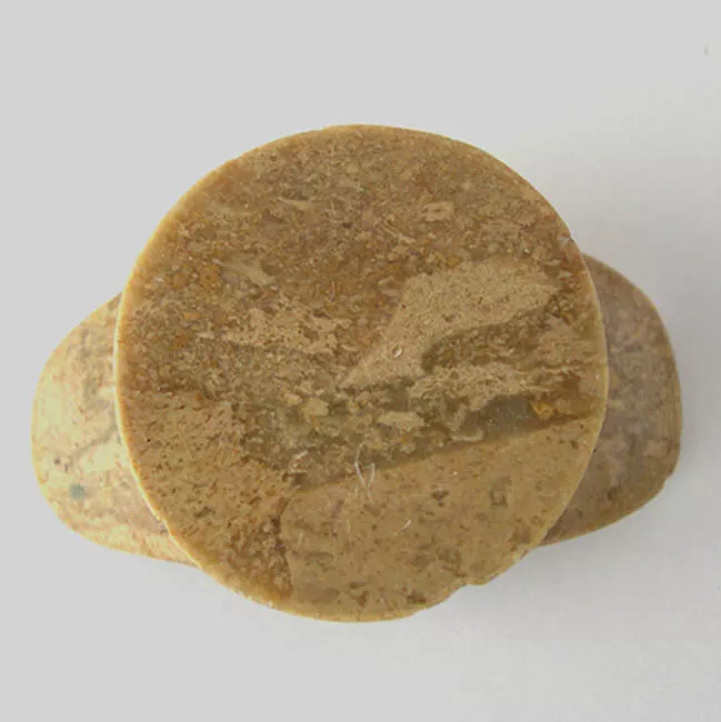 Objeto ornamental de uso personal elaborado en piedra talcosa de color café claro, de forma trapezoidal, bordes redondeados y sección plana. Presenta una perforación bicónica ubicada en la parte superior. Se observan estrías paralelas oblicuas por una de las caras, mientras que la cara opuesta se observa totalmente pulida.