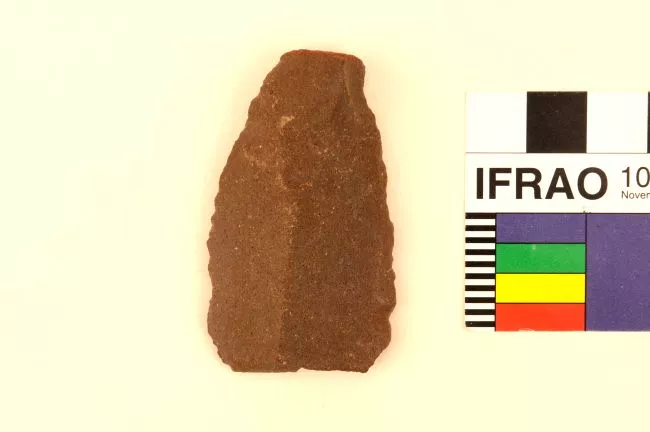 Fragmento lítico triangular café grisáceo rojizo. Una cara plana. Un e...