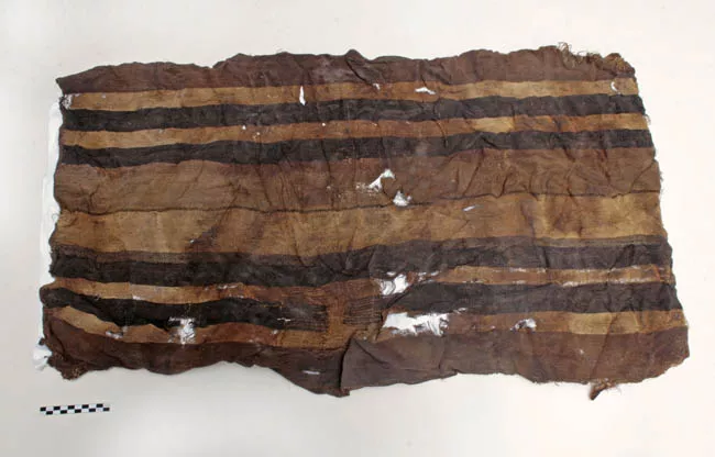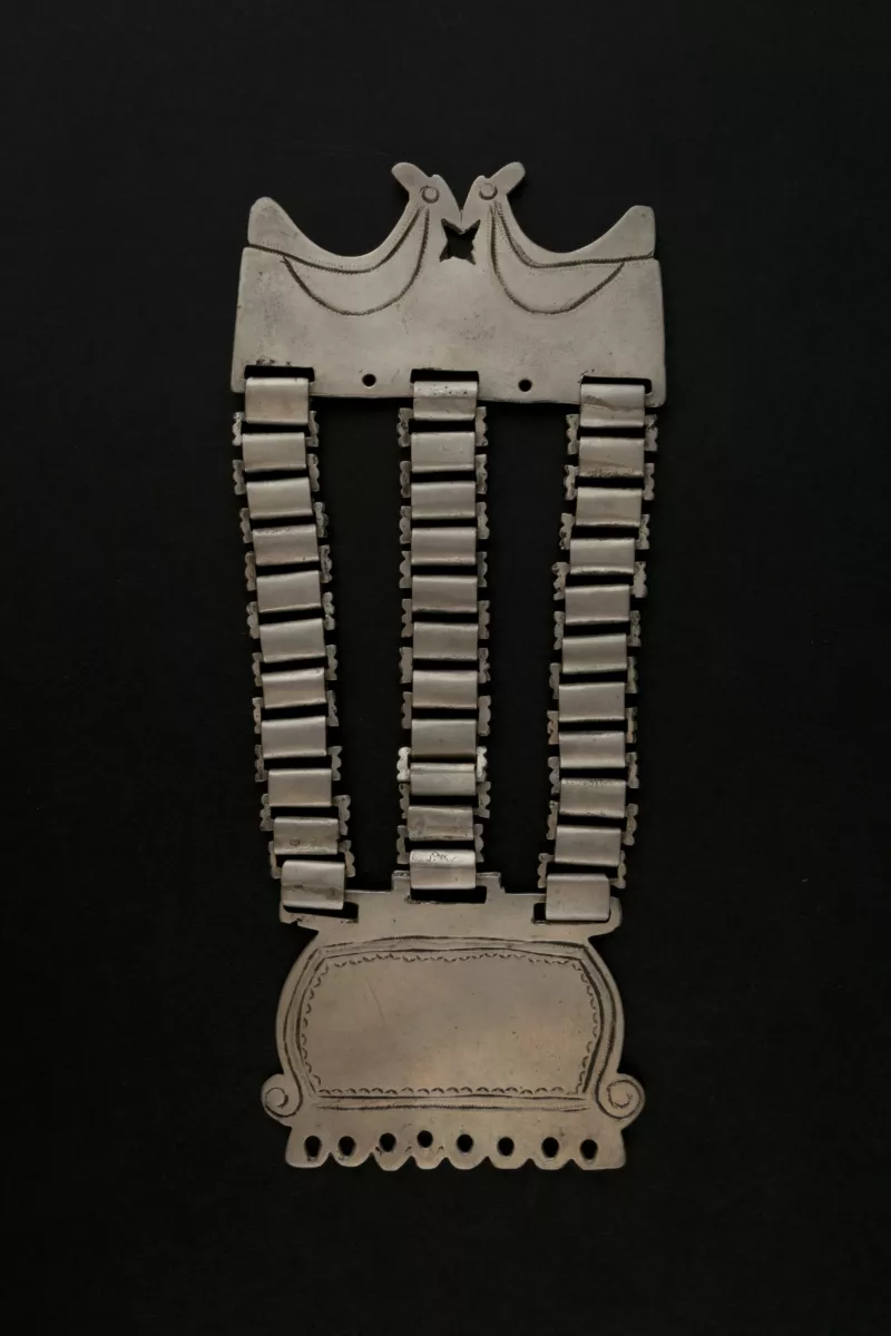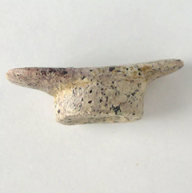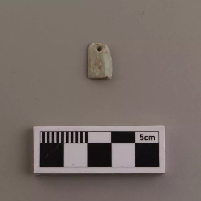 Objeto ornamental de uso personal de forma semicircular y sección transversal plana. Elaborado en lítico y reutilizado sobre una tortera fracturada, presenta una perforación bicónica en la sección superior, así como una decoración con motivos lineales señalados por incisiones.