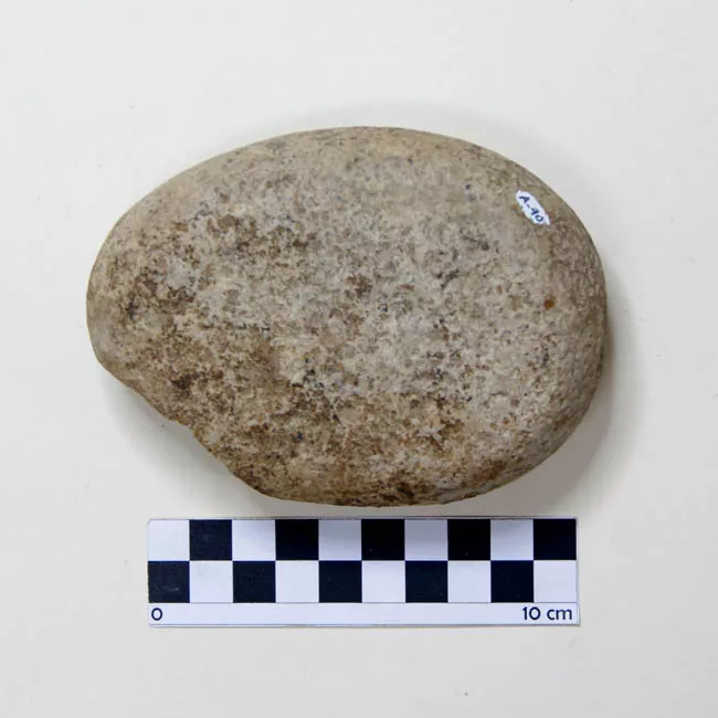 Artefacto de color gris claro con tintes marrones. El borde está aplan...