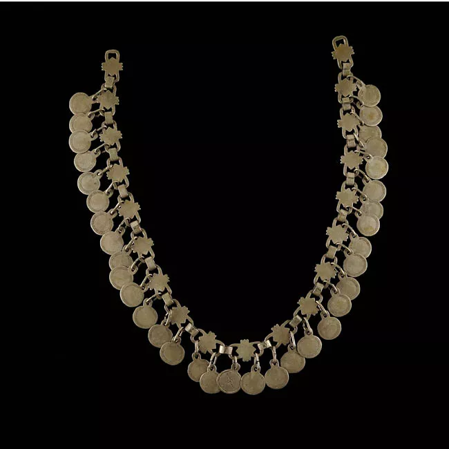Objeto ornamental de uso personal. Se encuentra conformado por 14 cuentas de Combarbalita y óseo. Las cuentas presentan forma discoidal o tubular con sección transversal plana y una perforación central cilíndrica o bicónica.
