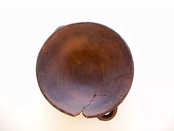 Objeto de uso doméstico. Contenedor de cuerpo globular. Boca restringida de labio irregular. Base plana restringida. Lleva un asa cinta en la parte superior del cuerpo. Superficie pulida y engobada sin decoración.