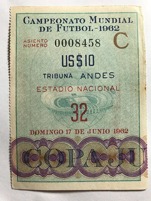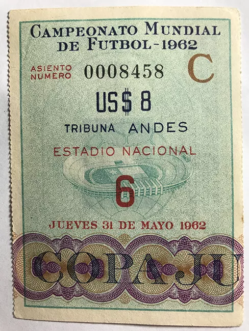 Objeto rectangular en disposición vertical. Papel impreso. En anverso marco blanco y dentro de él fondo celeste con ilustración del estadio nacional de Chile. El estadio es sostenido por una figura circular que asemeja a un globo terraqueo en su parte inferior y a un baón de futbol en suparte superior. Sobre el fondo textos impresos en diferentes colores (azul, rojo, negro y café). En la parte inferior, diseño con formas circulares de colores café y morado, sobre él texto impreso en tinta azul. En reverso, impreso en tinta azul y en disposición horizontal, plano de estadio nacional de Chile con sus distintas localidades. Abajo texto impreso en tinta azul.
