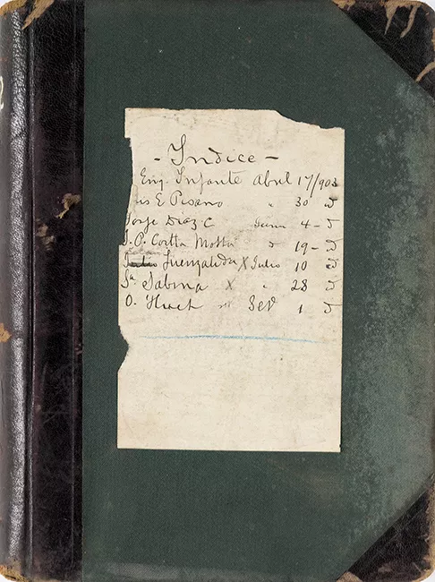 Objeto de tapas y lomo forrados en tela de color marrón. Hojas de colo...