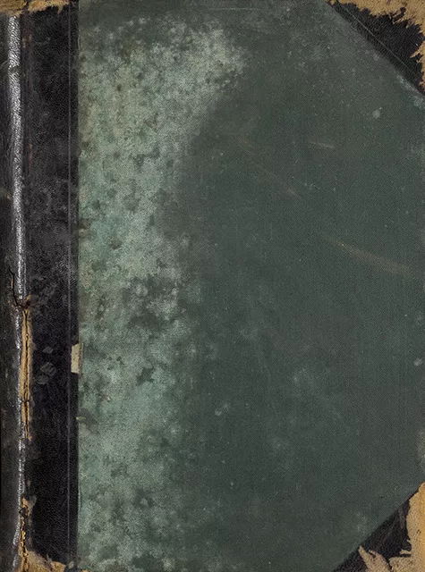 Objeto de tapas y lomo forrados en tela de color marrón. Hojas de colo...