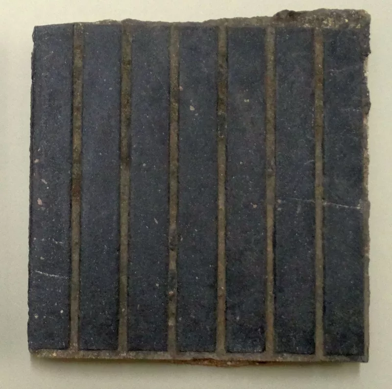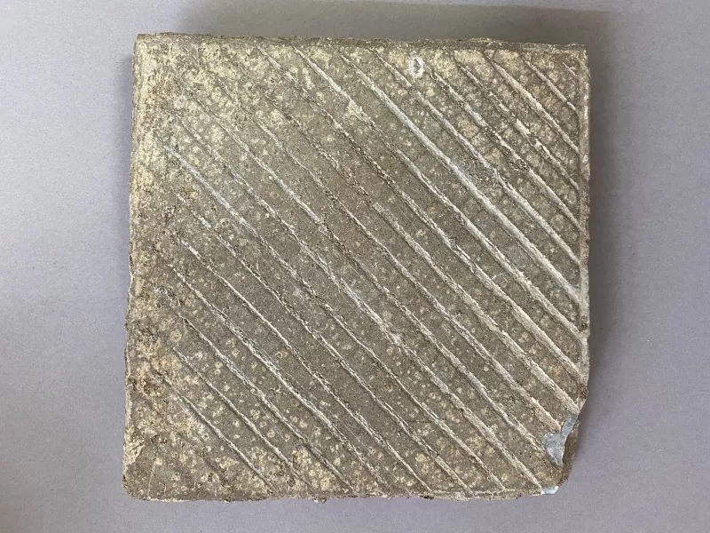 Elemento estructural usado en pavimento de pisos. Objeto paralelepípedo con decoración achurada incisa en la cara superior.